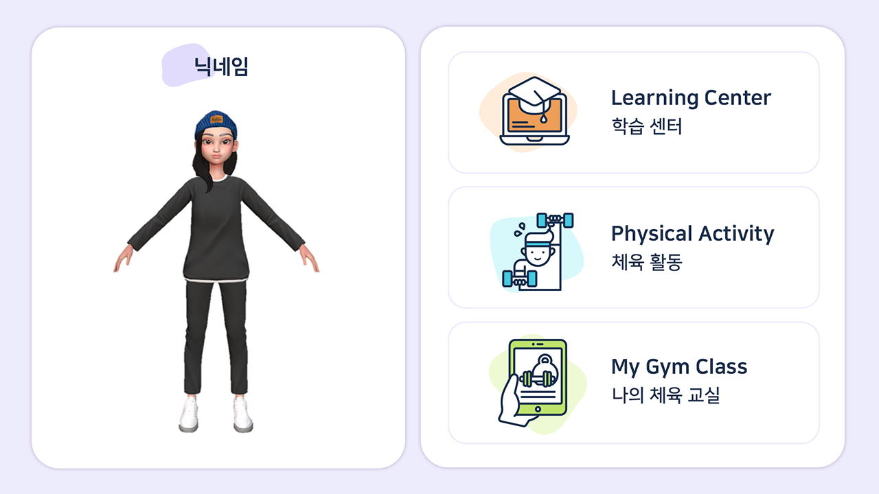 Los estudiantes pueden medir sus registros de ejercicio aeróbico utilizando el medidor de ejercicio aeróbico proporcionado en la aplicación y aprender cinco tipos de ejercicios de fuerza con un entrenador de ejercicios de IA basado en inteligencia artificial. Los resultados de la actividad física se convierten en dinero del juego para mejorar el avatar del estudiante. Los maestros pueden dirigir las actividades físicas de los estudiantes y monitorear los resultados de rendimiento de los estudiantes a través del menú del Centro de aprendizaje.