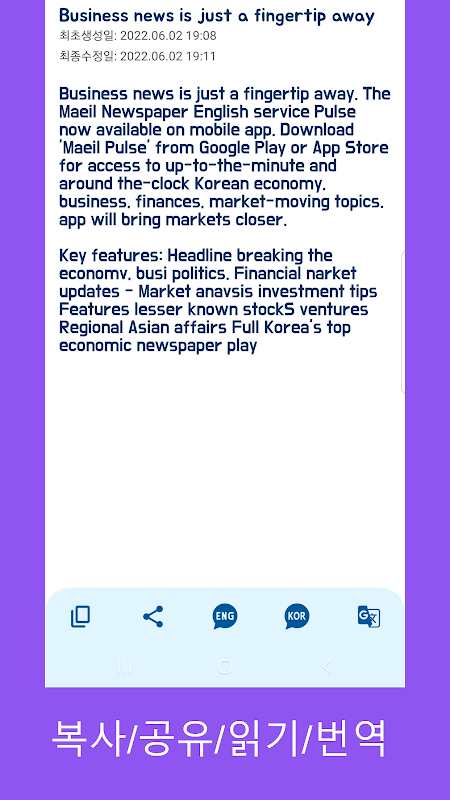 - 스캔된 텍스트를 확인하고 필요시 교정하여 저장해 주세요. 영어 번역이 필요할 경우 번역 버튼을 탭! 해 주세요.