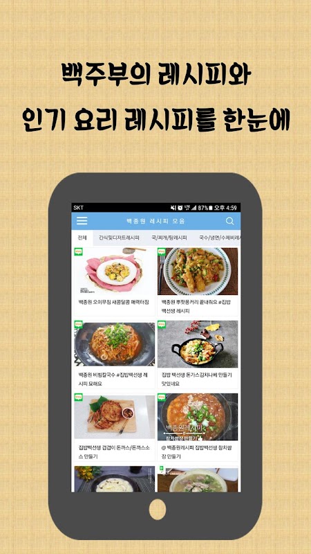 백종원 레시피 모음은 레시피 정보를 종합하여 쉽고 편하게 요리 정보를 찾아 볼 수 있는 종합 요리정보 제공 앱 입니다.