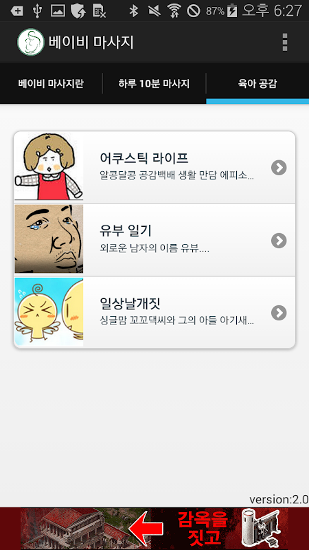 아이를 가진 모든 부모들을 위한 앱!!! 육아 공감 및 다양한 육아 관련 뉴스 포럼 웹툰을 제공하며 마사지 동영상 및 마사지 효능등 자세한 설명