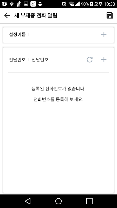 1. "부재중 전화 문자로 알림"에서 부재중 전화가 수신했을때 알림을 전달한 전화번호를 설정 하세요. 모든 부재중 전화에 대해서 알림 SMS를 전달 합니다.