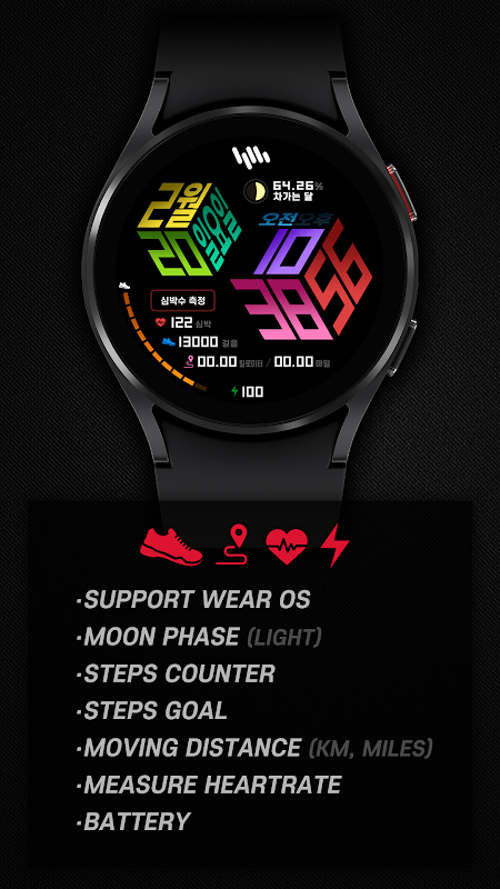 WatchFace tiene una batería, un contador de pasos y una medición de frecuencia cardíaca.