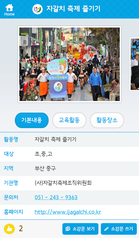 활동 장소에는 주소를 통한 지도 검색기능, 교통편, 주차상황 등을 제공하여 개인 혹은 가정과 방문하여도 불편함이 없도록 정보를 제공하였습니다.