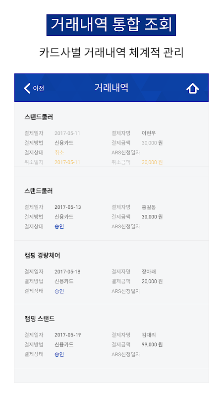 - 거래형태별, 기간별 조회를 통해 상세 카드 결제내역 확인이 가능합니다.