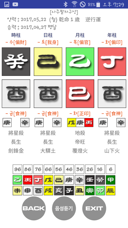 사주역학을 공부하는 시각장애인을 위한 앱으로 음성으로 사주를 입력받고 음성으로 팔자와 12운성, 납음오행 대운을 읽어주는 앱