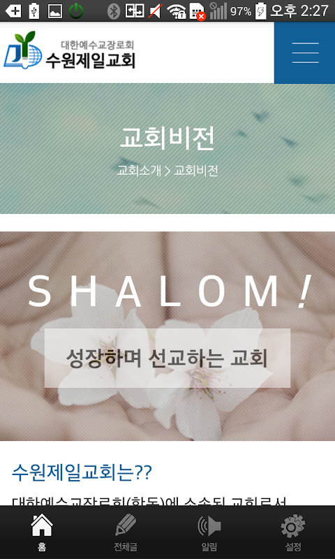 * 100% 연동형 앱 : 홈페이지에 등록된 내용, 게시물, 설교영상, 사진 등의 콘텐츠를 앱과 100% 연동하여 실시간으로 앱을 통해 확인할 수 있습니다.