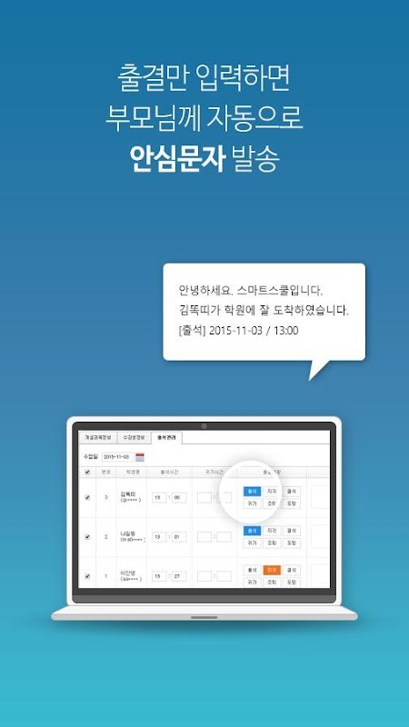 출석부 들고 다니지 말자! 선생님 혼자 일일이 체크하지 말자! 학생이 직접 번호만 누르면 출결문자 까지 날려주는 스마트한 무료 출석체크 App!