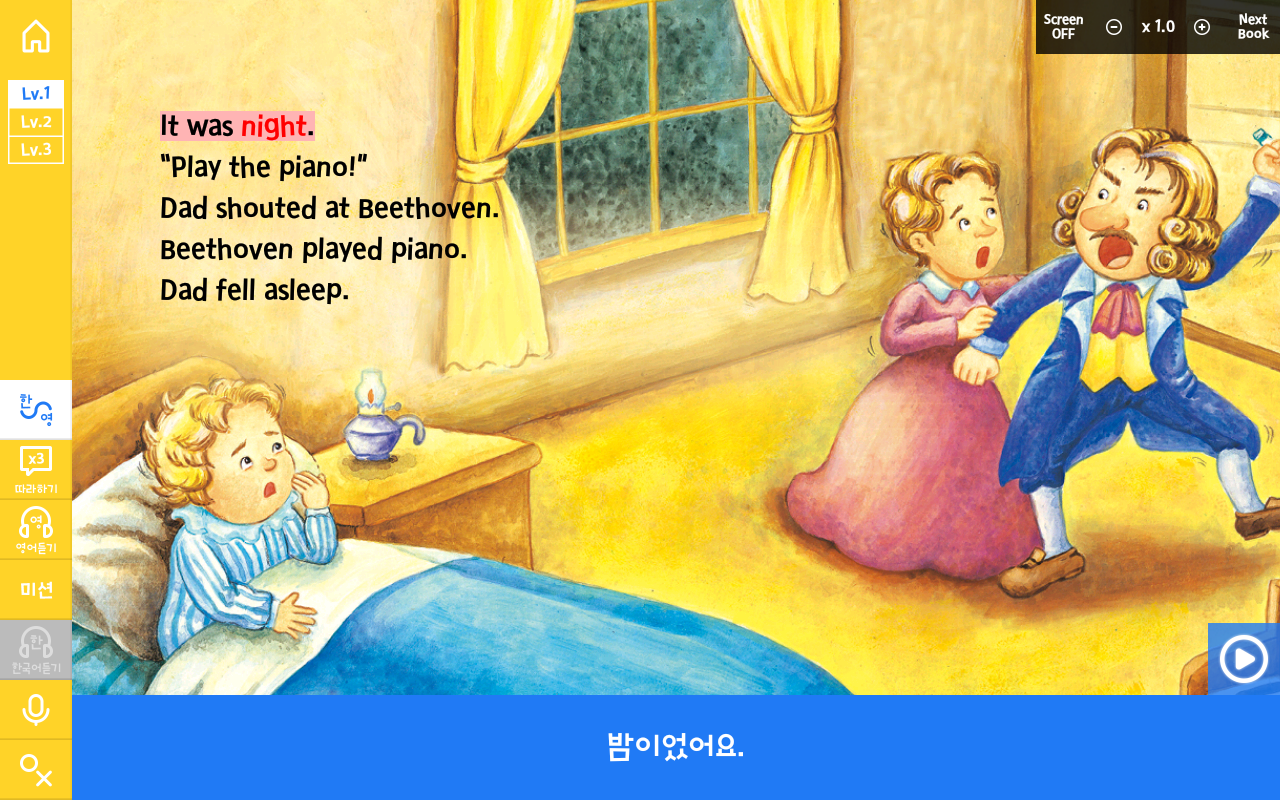 세상에 하나밖에 없는 영어동화. 세계명작부터 창작동화까지, 총 3가지 레벨로 구성된 260권의 영어 스토리북! 영어로 듣기, 한국어로 듣기, 3번따라하기, 녹음, 퀴즈 등의 옵션을 통해 아이 스스로 자발적으로 공부합니다.
