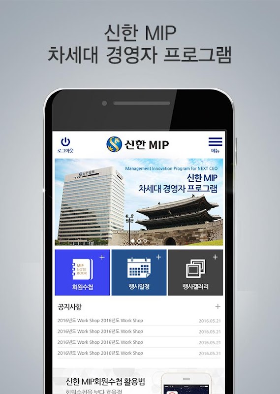 신한은행 MIP 회원들의 정보를 열람할 수 있는 모바일 수첩 어플리케이션입니다.