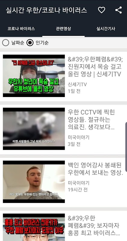 코로나 바이러스 , 중국 우한 발병한 바이러스에 관련된 기사와 유튜브의 내용을 실시간으로 제공하는