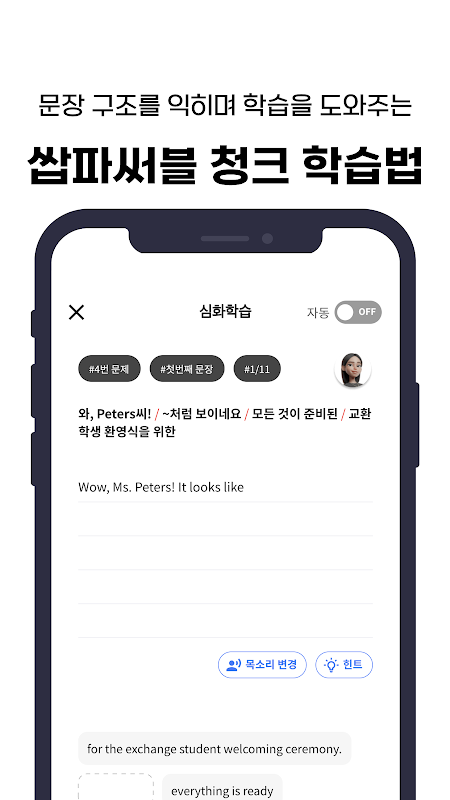 - Los usuarios pueden comprender más fácilmente el significado y la estructura de las oraciones haciendo clic en los fragmentos en inglés en orden mientras miran los fragmentos en coreano, y haciendo clic en los fragmentos en coreano en el orden correcto mientras miran los fragmentos en inglés.