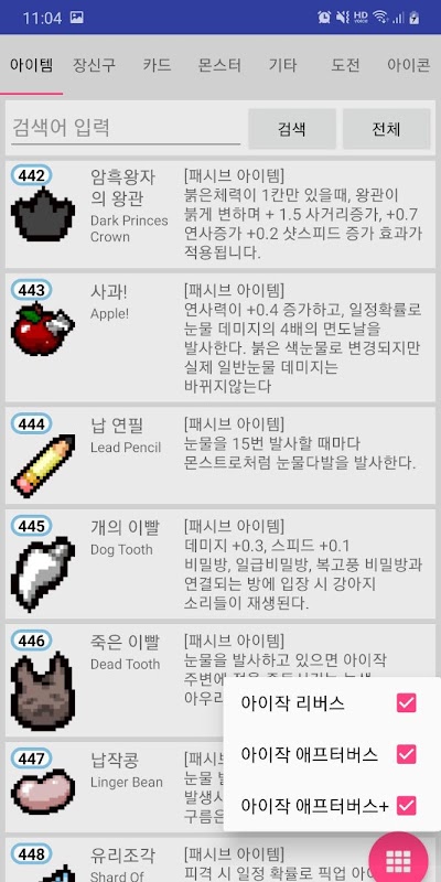아이작 리버스,애프터버스,애프터버스+ 아이템, 몬스터, 기타정보를 검색할 수 있습니다.
