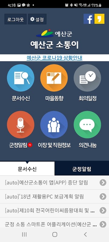 Esta es la e-jangnet móvil de Yesan-gun que permite a los presidentes de Yesan-gun y de cada aldea verificar información administrativa, como documentos, notificaciones, reuniones y gerentes en una PC o dispositivo móvil.