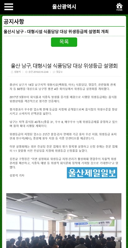 ■ 울산시의 음식점 위생수준 향상과 위생등급지정을 위해 꾸준히 노력하겠습니다.