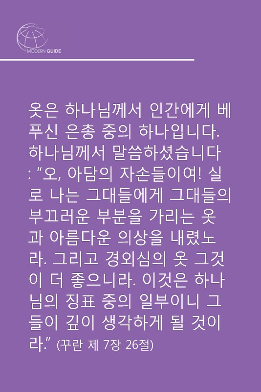 본 어플은 이슬람에서의 의복에 관해 다루고 있다. 무슬림은 어떤 옷을 입어야 하며 의복의 기본 원칙은 무엇인지, 금지된 옷은 무엇이 있는지 등을 설명하고 있다.
