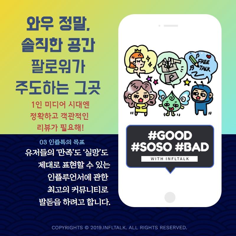 인플톡에서는 인플루언서들과 그 사람들이 소개하는 정보들을 자주적으로 평가할 수 있고 솔직한 이야기들을 나눌 수 있는 공간을 제공하려고 합니다. 인플톡은 유저들의 ‘만족’도 ‘실망’도 제대로 표현할 수 있는 인플루언서 평가 커뮤니티로 능동적인 발돋음을 하려고 합니다.