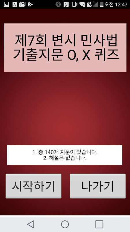 제7회 변호사시험(2018) 민사법 기출지문 OX 퀴즈 어플입니다. 총 140개의 민사법 기출지문이 있으며, 저작권과 기술력의 부족으로 해설은 싣지 못했습니다. 문제가 랜덤으로 나오기 때문에 푸신 문제는 다시 볼수 없습니다.