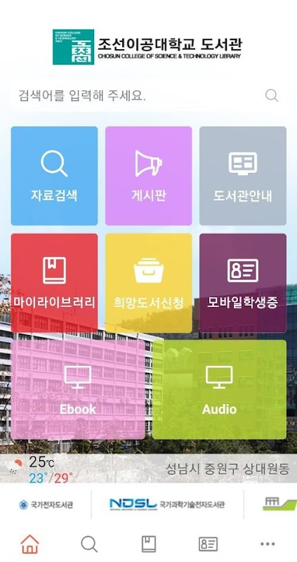 조선이공대학교 도서관의 도서 정보 조회 및 대출정보, 희망도서를 신청 할 수 있는 안드로이드용 모바일 어플리케이션 입니다.
