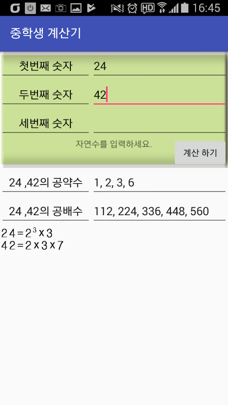 소인수분해, 함수 등.풀이가 있는 중학 수학 계산기.단순한 덧셈 뺄셈이 아닌.소인수분해, 연립방정식, 이차방정식 등 중학교 전과정.