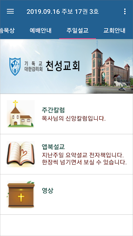 천성교회 성도들이 종이주보 대신에 스마트폰에서 매주 주보를 볼 수 있는 100% 네이티브앱(어플) 스마트주보입니다.