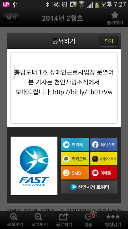Artículos de Twitter, Facebook, Kakao Story, kakaotalk, correo electrónico, capacidades de texto para compartir