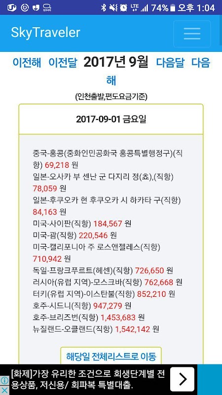 인천에서 전세계기항지로 출발하는 편도요금의 내역및 일자에따른 3~7일 일정의 왕복요금 확인이 가능합니다.