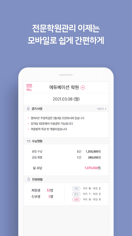 Además, desde pagos generales en línea hasta pagos de cuentas simples, facturas de Kakao Pay y pagos en persona no presenciales. Puedes elegir el método de pago que se adapte a tu academia entre varios servicios de pago.