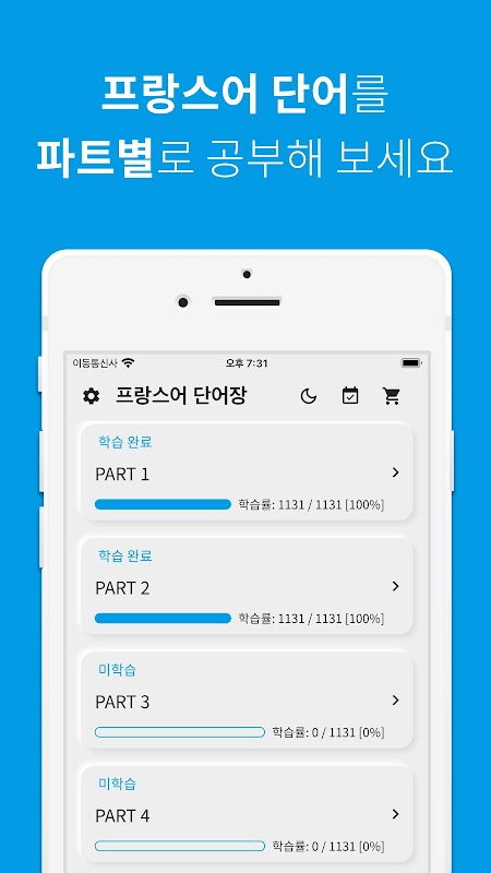 ¡Estudiar palabras se trata de repetición! Puedes revisar las palabras en francés que estudiaste por parte, unidad o unidad completa.