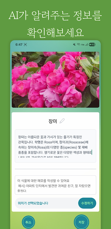 La IA analiza automáticamente la planta y completa tu propio diario con la ubicación.