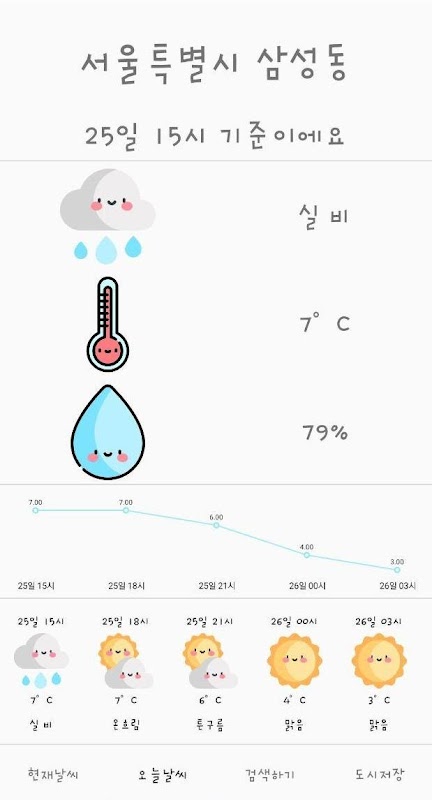 현재 위치의 날씨, 오늘의 날씨, 시간단위(3시간)당 예보를 볼 수 있습니다. 대한민국의 주요 도시 날씨를 검색 할 수 있습니다.