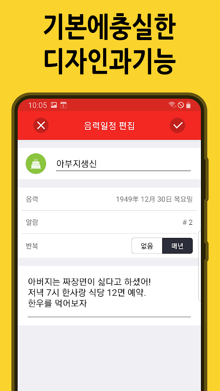 Si es así, intente usar el calendario lunar que es perfecto para los coreanos. No hay problema de verificar la fecha lunar cada año e ingresar el horario. Una vez ingresado, se repite automáticamente todos los años y suena una alarma, por lo que nunca podrá olvidarlo.