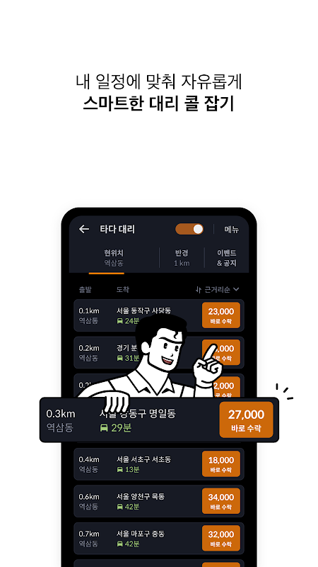 콜리스트를 확인하고 내 일정에 맞춰 자유롭게 원하는 콜을 수락하세요.