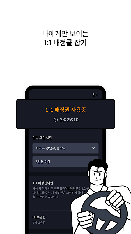 1:1 배정권으로 내가 선호하는 콜을 단독으로 확인하세요. 미션 수행 및 이벤트로 1:1 배정권을 획득할 수 있습니다.