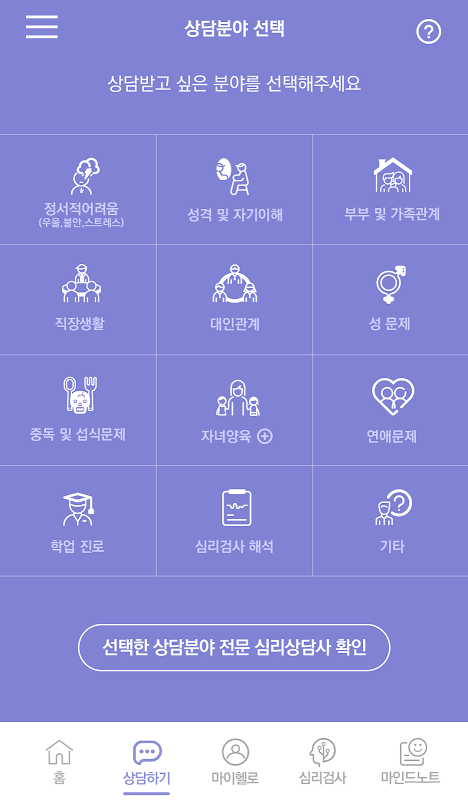 1. 심리상담 : 보건복지부와 한국심리학회가 공인하는 자격증을 소지한 전문 심리상담사를 앱을 통해 음성 또는 영상으로 만나실 수 있습니다.(예약/실시간상담)