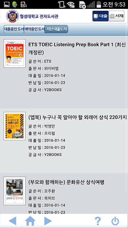 Universidad Hyupsung préstamo de e-biblioteca para proporcionar a los miembros con un servicio de e-libro, la autenticación de usuario por el objetivo. Buscar ebooks, préstamos y a través de un teléfono inteligente en cualquier momento y en cualquier lugar la lectura es posible.