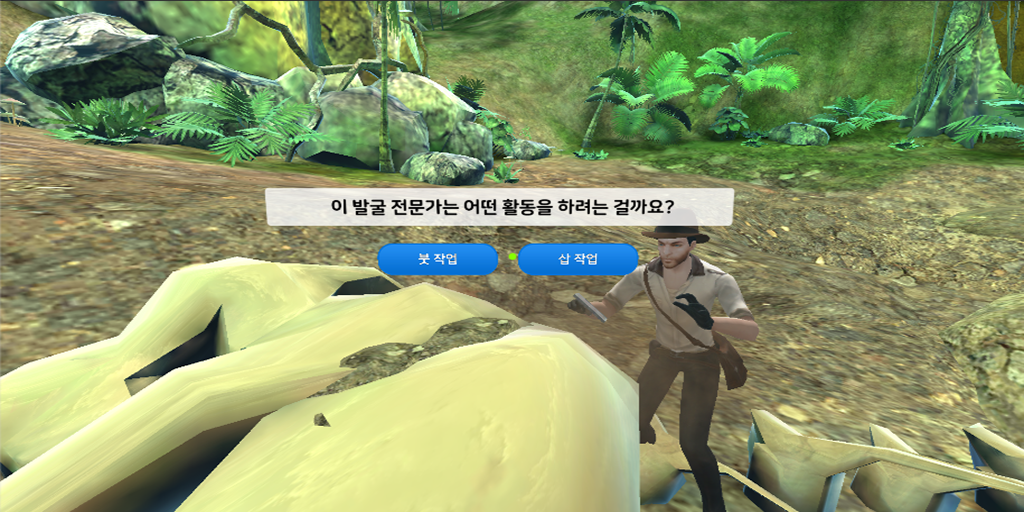 '화석발굴 체험'은 가상의 발굴 현장에 가서 주변을 살펴보고, 발굴 활동에 참여해 보는 VR 체험 콘텐츠입니다.