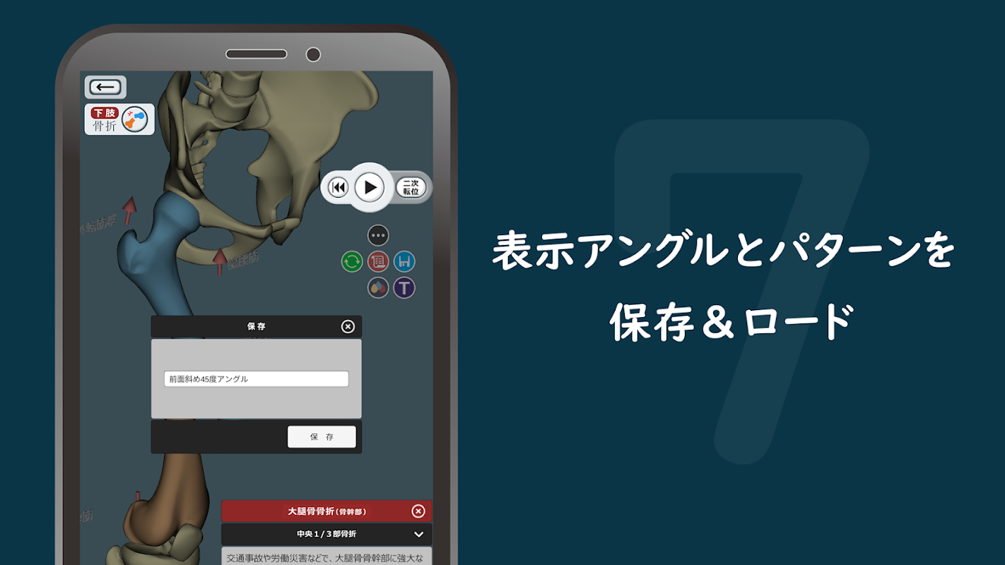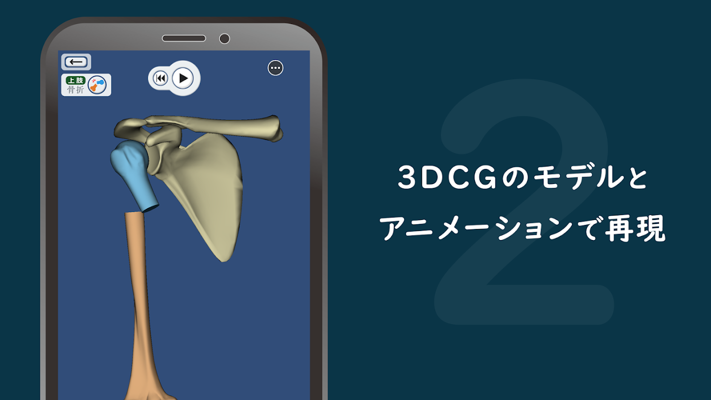 Una app para aprender fracturas y luxaciones que reproduce fracturas y luxaciones de miembros superiores e inferiores con un modelo 3DCG y animación.
