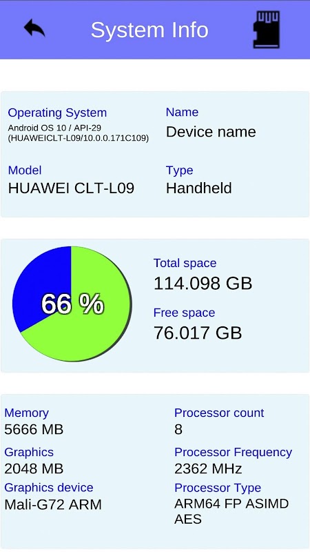 * System tester: Displays the internal fixed memory capacity and the percentage of use. Indicates the name and model of the device. Processor name and type, GPU type and memory, processor speed and number of processors.
