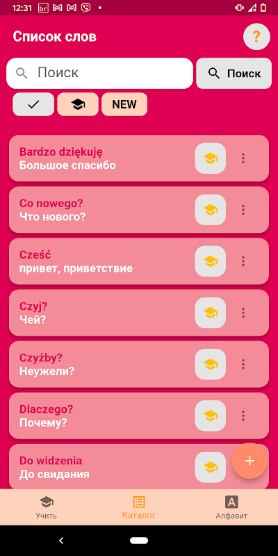 Además de la lista existente de las palabras polacas más utilizadas, la aplicación tiene la capacidad de agregar sus palabras al diccionario polaco.