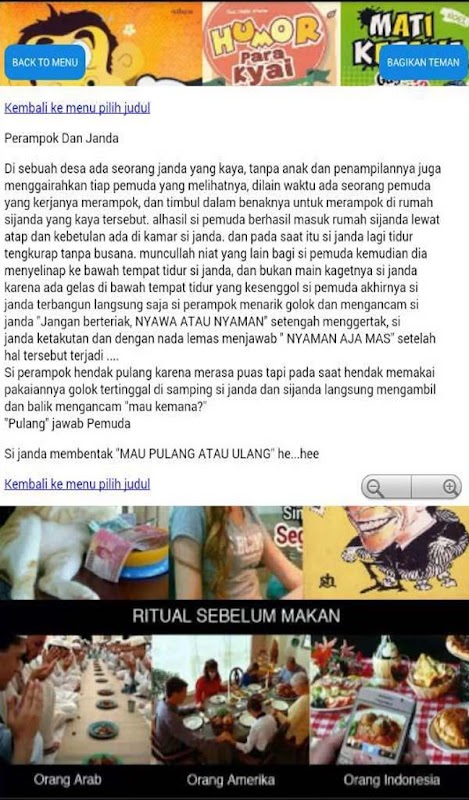 Kumpulan cerita lucu, humor dan tebakan kocak yang bisa menemani kita dikala suntuk dari pada bengong mending baca cerita humor yang bisa memancing tawa. Aplikasi offline ini bisa diunduh gratis disini.