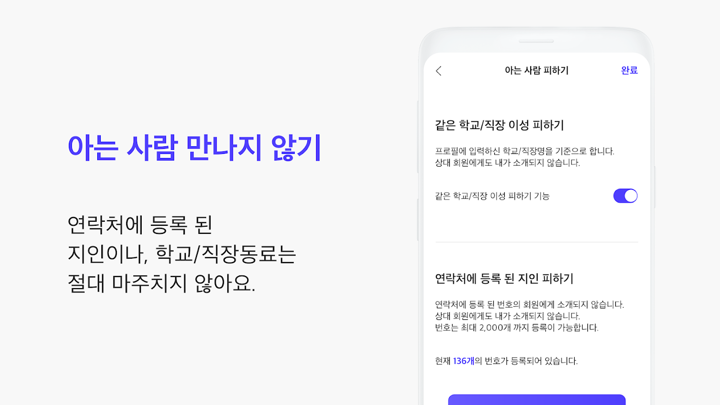 1percent는 (1) 등록된 전화번호로 만나지 않기 (2) 같은 학교/직장 동료 만나지 않기 기능을 제공하기 때문에 소개팅 상대로 피하고 싶은 친구, 동료, 선후배 등과의 만남을 피할 수 있습니다.