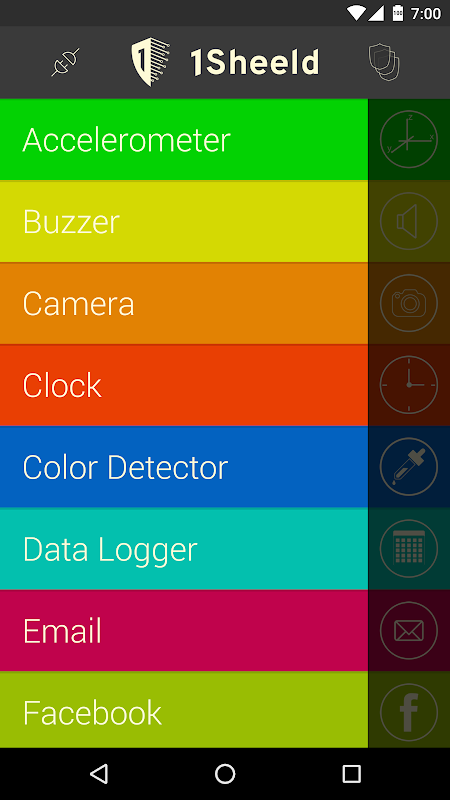 1Sheeld app is used along with our hardware shield to either control Arduino, read your smartphone's sensors in your Arduino sketch, post on social media, or even control your Android device.