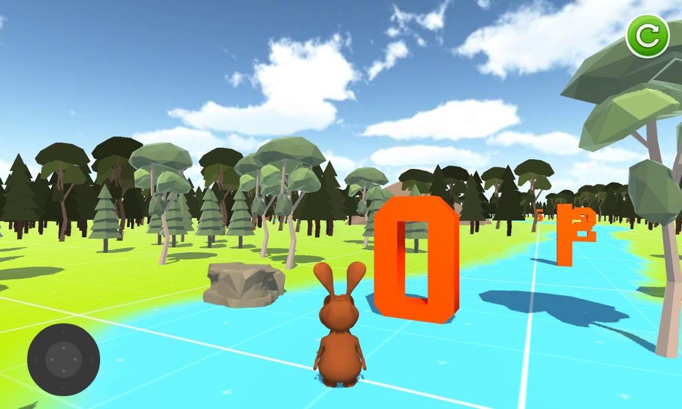 He walks around a green, welcoming environment with small lake between the mountains and search for 3D letters of the alphabet (ABC) to eat :))