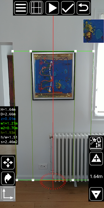 Medir y Alinear - 3D Plomada + es una aplicación de realidad aumentada que muestra un marco virtual en la parte superior de la imagen de la cámara. Este marco permanece vertical sin importar la orientación de su dispositivo. Las dimensiones del cuadro se muestran en tiempo real.