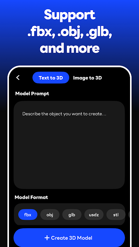 Exporte sus creaciones en formatos .fbx, .obj, .glb, .usdz, .stl y .blend, listas para motores de juegos, impresoras 3D, proyectos AR/VR y más.