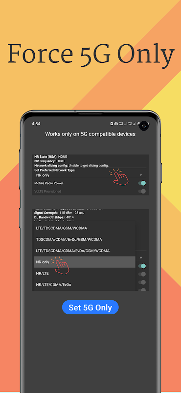 ¡Desbloquea todo el potencial de tu dispositivo con el modo solo 5G! Nuestra aplicación está meticulosamente diseñada para ayudarlo a maximizar la conectividad de su teléfono al habilitar la red 5G exclusivamente. Al utilizar las capacidades avanzadas de la clase RadioInfo, el modo 5G Only le permite cambiar el modo de servicio de su teléfono a 5G, lo que garantiza que experimente las velocidades más rápidas y un rendimiento de red superior disponible.