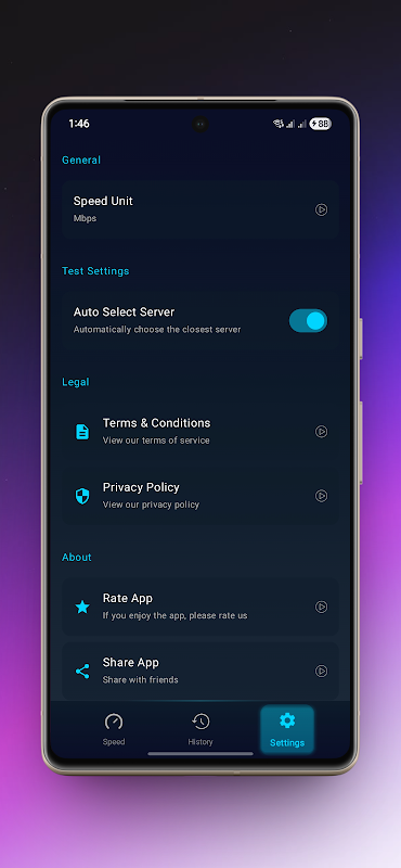 Experimenta las pruebas de velocidad como nunca antes con nuestro atractivo velocímetro animado, transiciones fluidas y una atractiva interfaz con tema oscuro que es agradable a la vista.