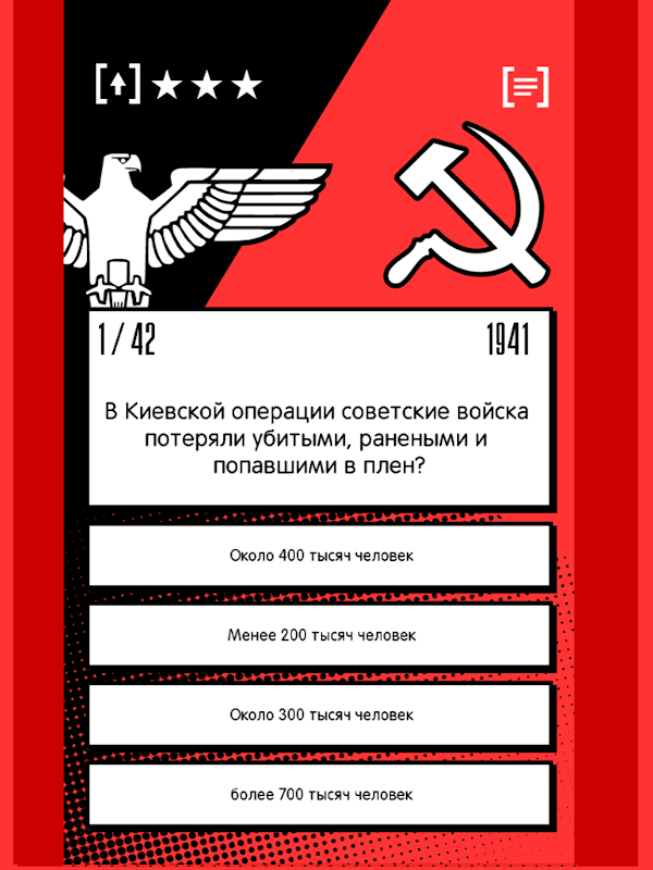 "El 9 de mayo - el precio de la victoria" - es un cuestionario militar único sobre la "Gran Guerra Patriótica". El cuestionario abarca el período comprendido entre 1941 y 1945, y pone a prueba sus conocimientos con el mayor detalle posible. La Segunda Guerra Mundial se cobró muchas vidas inocentes y debemos recordarla y honrar la memoria de nuestros antepasados. Comprende lo difícil que fue para nuestros antepasados, el Día de la Victoria.