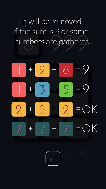 Intenta eliminar los bloques constantemente organizando los números correctamente en la cuadrícula de 9. Debes seguir eliminando bloques antes de que el campo se llene de números.