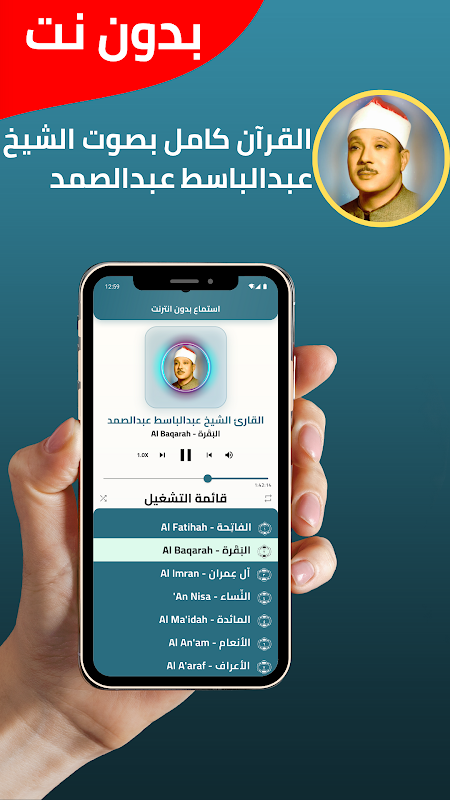 La aplicación presenta todas las suras del Sagrado Corán con la voz del Jeque Abdul Basit Abdul Samad en alta calidad, lo que te hace sentir cómodo y tranquilo mientras escuchas. La recitación se caracteriza por una voz clara e influyente que ayuda a contemplar los versos de Dios.